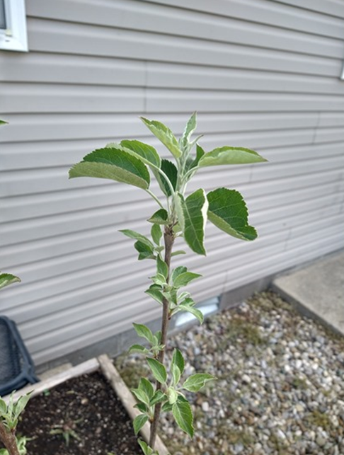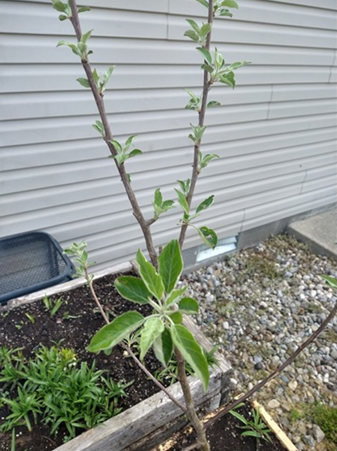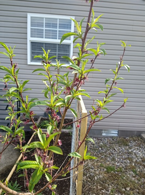 I added an Apple tree to the planter that contains the peach tree. This is a Red Delicious apple tree sprouting leaves for the spring.![]()