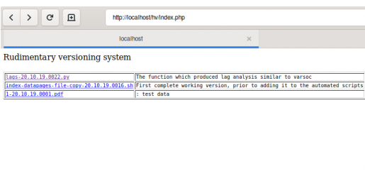 From the directory with the file to be versioned, the command historicalcopy is typed. This creates a directory in the current directory called local-historical-versions and copies the historical version into that directory. It then copies the file to a complete historical versions archive and appends a PHP file in the web-server directory with both a link and comment. The reason periods are used instead of dashes is because experience demonstrated that my software using Python had difficulty with filenames incorporating dashes. This naming style is similar to the RPM naming convention which uses name-version-release. This rudimentary versioning system uses a timestamp as the version number. There are plenty of more advanced systems such as git, but sometimes we can work more efficiently with a simple direct historical list of what file did what way back when. This could easily be changed so that an html file is updated in a local directory instead of a PHP file on a web-server. The PHP file is future usage incorporated with user authentication and a long term code repository. The code can then be used on OSX and Windows Subsystem Linux by pulling the PHP to the local machine, inserting the necessary file, and then transferring it back to the web-server via SSH. In a way that seems like Git, but this is for the use case where one wants a simple to use list.